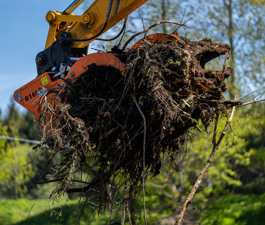 Roderechen zum Aufarbeiten von Baumschnitt und Wurzelmaterial am Waldboden
